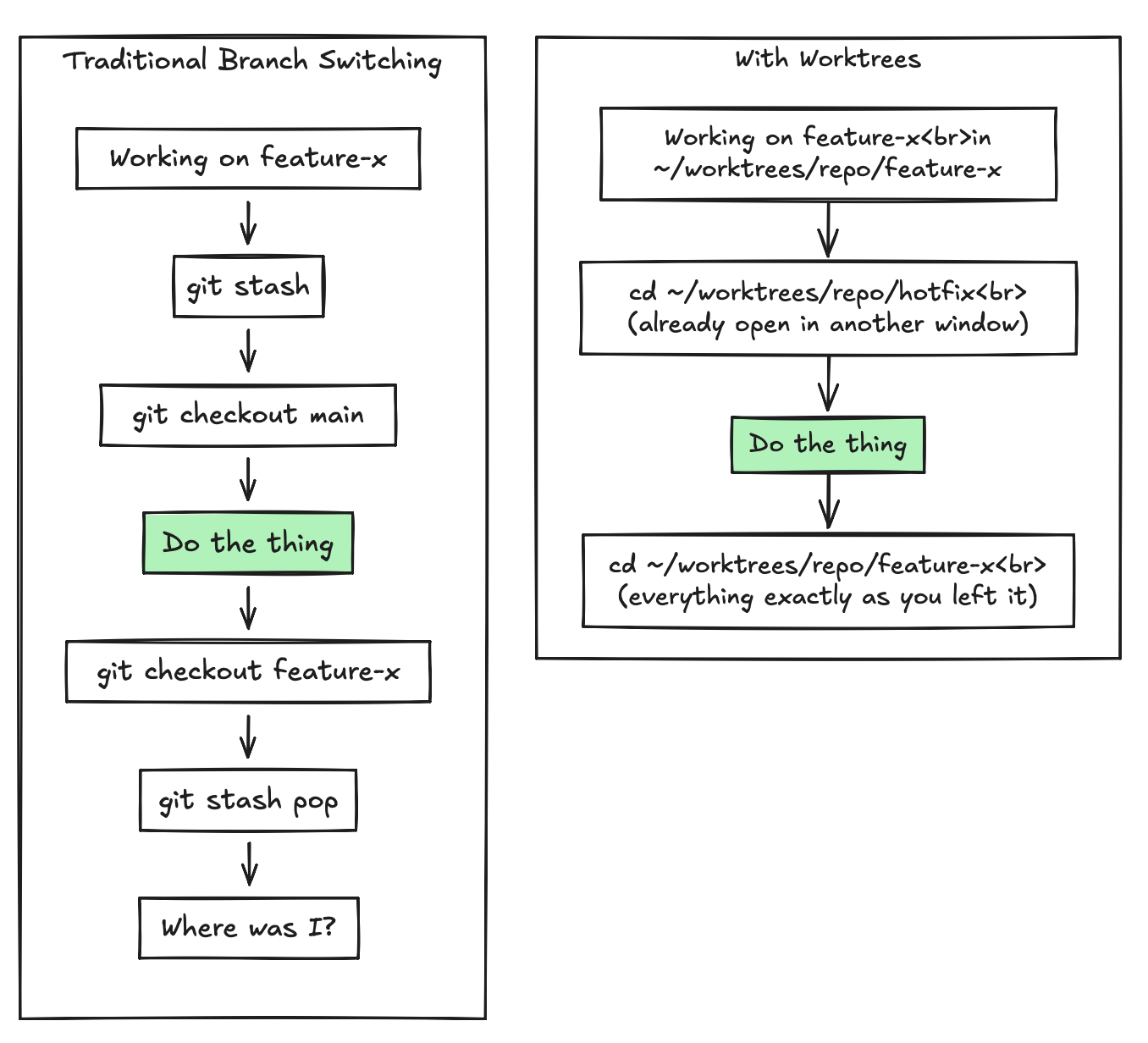 git stash(or worse, a WIP commit you’ll forget about)git checkout other-branchWait for your editor to reload, your dev server to restart, maybe a fresh