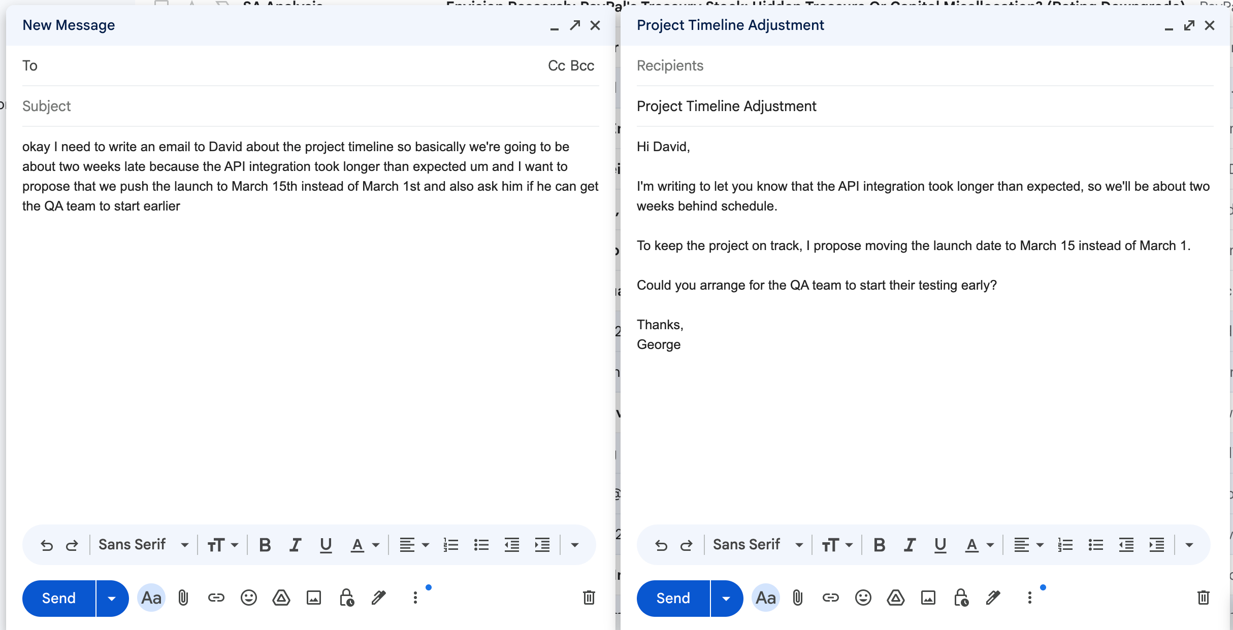 Take the raw spoken input and produce a well-structured email.